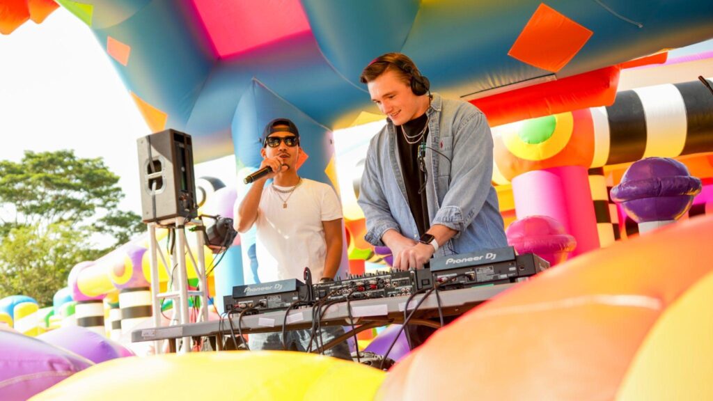 派對現場當然少不了音樂!現場除了全日無間斷舉行大人小朋友都喜愛的泡泡派對外,亦有不同的本地及海外DJ日夜駐場,部份「黑夜彈跳派對」更邀請到城中最紅 DJ Johnnie Darka、YAAT及Angus,接連為各位炒熱現場熾熱氣氛!「黑夜彈跳派對」每晚都特設主題音樂派對如K-POP、Y2K及懷舊Disco夜,誠邀大家約定三五知己根據主題穿著打扮,一同沉浸於前所未有的節日歡愉,盡情躍動!