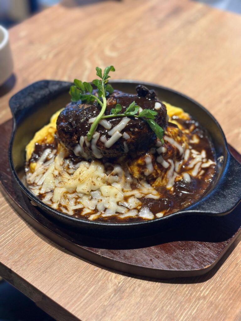 「肉オムライス専門店 肉とたまご」的菜單精心設計,主打的是鐵板漢堡,這道料理可以說是餐廳的招牌之作。每當熱騰騰的鐵板端上桌時,首先映入眼簾的是一塊飽滿多汁的漢堡肉,燒烤至外焦內嫩,表面略帶焦香,散發著誘人的香氣。這塊漢堡肉與一顆滑嫩的煎蛋搭配,煎蛋的蛋黃剛好熟成,輕輕一切便能流淌出金黃的蛋黃,與漢堡肉融合在一起,形成絕妙的搭配。