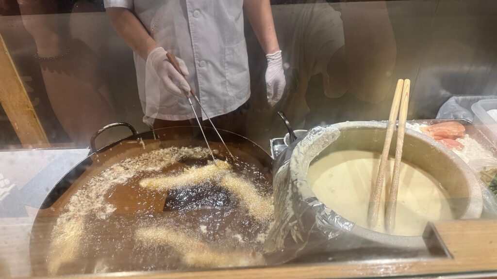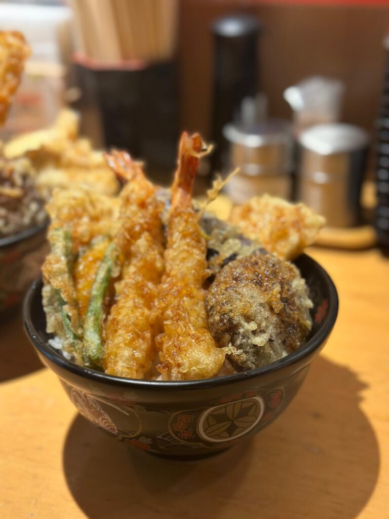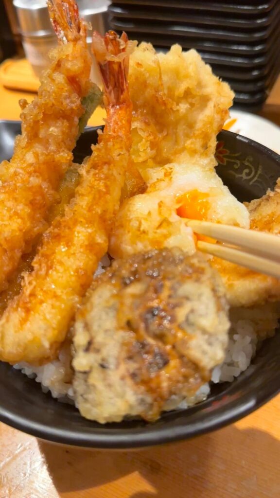 在這裡,每一碗天丼都由經驗豐富的廚師精心製作,遵循著長年傳承的手工技藝。首先,廚師會選用最新鮮的食材,包括大蝦、白魚、以及季節性蔬菜等。這些食材會被裹上一層薄薄的特製天婦羅麵糊,這個過程講究輕巧與均勻,使麵糊能夠充分包裹住食材的鮮美。接著,食材被放入熱油中炸至金黃酥脆,保留了內部的鮮嫩與多汁。炸製過程中,廚師熟練地掌握油溫與火候,確保每一口天婦羅都外脆內嫩。