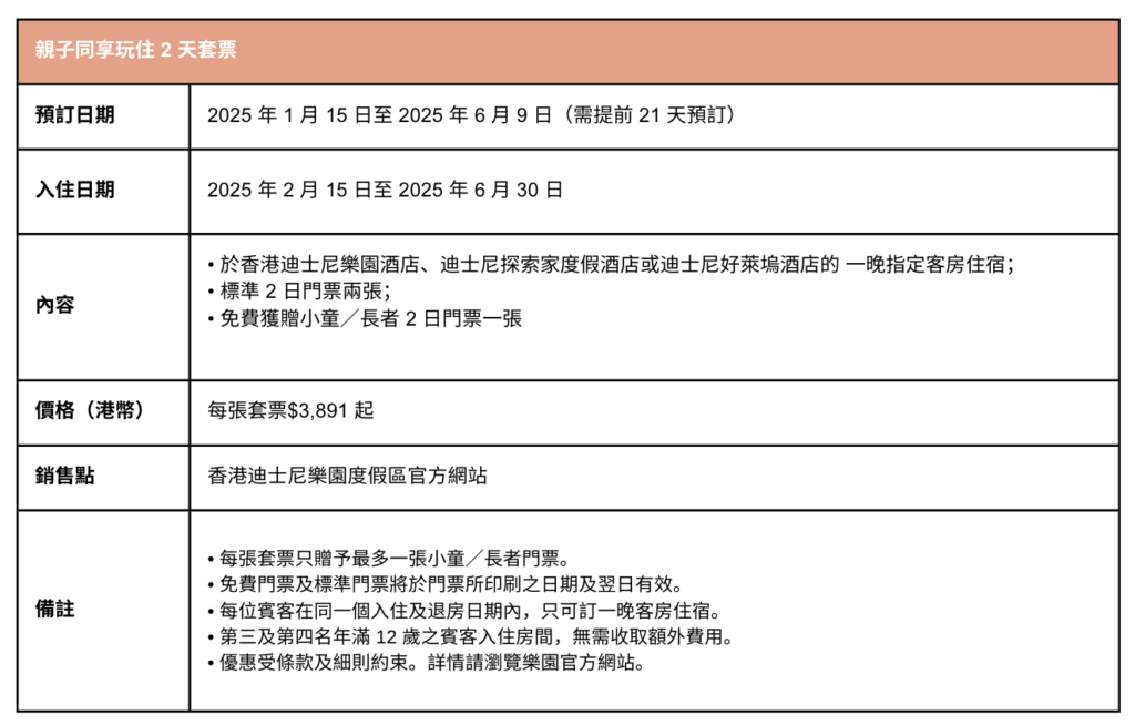 由 1 月 15 日至 6 月 9 日, 於香港迪士尼樂園度假區官網預訂「親子同享玩住 2 天套票 」優惠,包含標