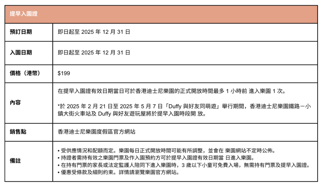 要令旅程更奇妙,賓客可購買提早入園證,在樂園正式開放時間最多一小時前進入樂園率先投入魔法時