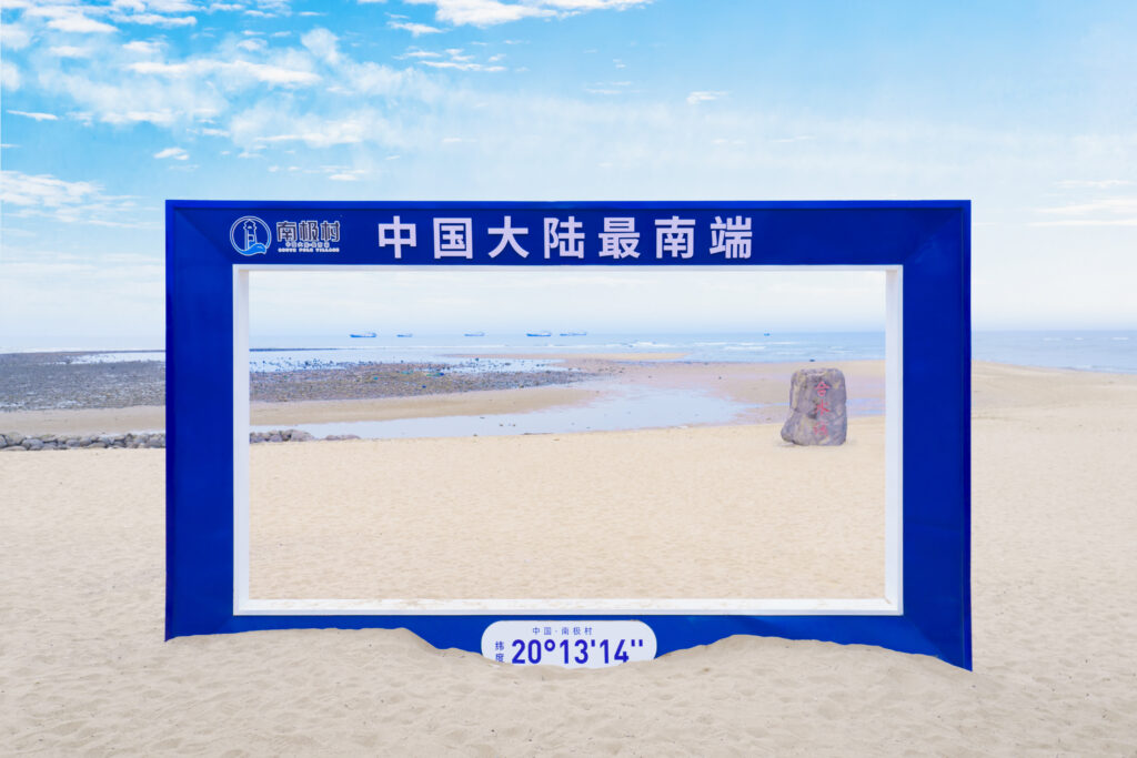 而南極村尖沙洲上的 “合水線”,是瓊州海峽 (南海) 和北部灣的分水線,這裡可以清晰看到兩側海水交匯;在潮退時會出現沙州、還可以見到兩邊海灣的海浪相互拍打,形成罕見的「V 字浪」,當地人稱這道奇觀為「接吻潮」,吸引不少情侶前來「朝聖」。