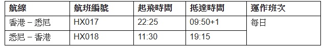 香港航空來往香港和悉尼的航班詳情*如下(所有時間均為當地時間):