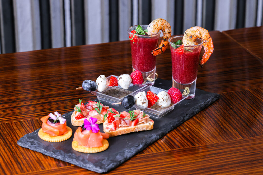「鳥語花韻果香三道菜下午茶」由行政總廚何偉誠師傅 (Danny Ho) 精心策劃菜單,帶領擁有絕佳手藝的廚藝團隊創作是次春意盎然的菜單。從滋味的前菜、豐富的自選主菜到精緻的甜點,都巧妙地加入了多款水果包括士多啤梨、黑莓、藍莓及紅桑子,讓食客沉浸式地享受果香濃郁的食物之中!下午茶由4款創意滋味前菜掀開序幕,包括:煙三文魚伴莓果脆餅、巴馬火腿伴士多啤梨意式多士、迷你水牛芝士波雜莓果串及凍莓湯香辣蝦一口杯,將新鮮的水果完美地配搭各款鹹點之中,酸酸甜甜的清新果香成為最佳的開胃菜!