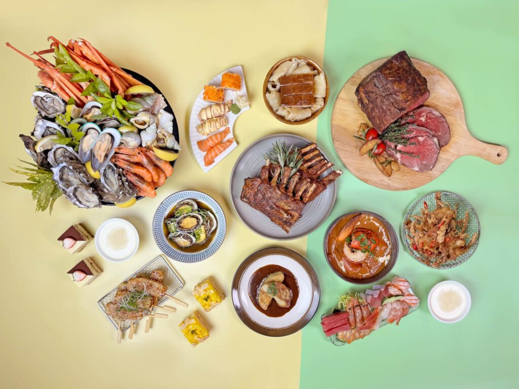 自助餐更設有現場即製專櫃,包括:入口即化的煎鴨肝伴黑松露汁及濃郁鮮甜的生滾龍蝦湯。此外,廚師團隊以精湛的廚藝呈獻一系列「鮮味」熱葷,包括:包括:避風塘軟殼蟹,以經典的港式避風塘製作,每一口都能感受到外脆内嫩的口感及惹味豐富的香料滋味;日式清酒慢煮原隻鮑魚,鮑魚在清酒的溫潤慢煮下,充分吸收了湯汁的鮮美與清酒的淡雅香氣,滋味無窮;燉煮到恰到好處的花膠紅燒肉,軟糯入味,滋補養顏。其餘「味」力佳餚更有:肉汁豐腴的燒牛肉及燒羊扒、焦香多汁的日式免治雞肉棒、酒香四溢的紅酒燴牛舌及清嫩鮮滑的清蒸石斑等,每款菜式各具特色,帶來層出不窮的味覺體驗。