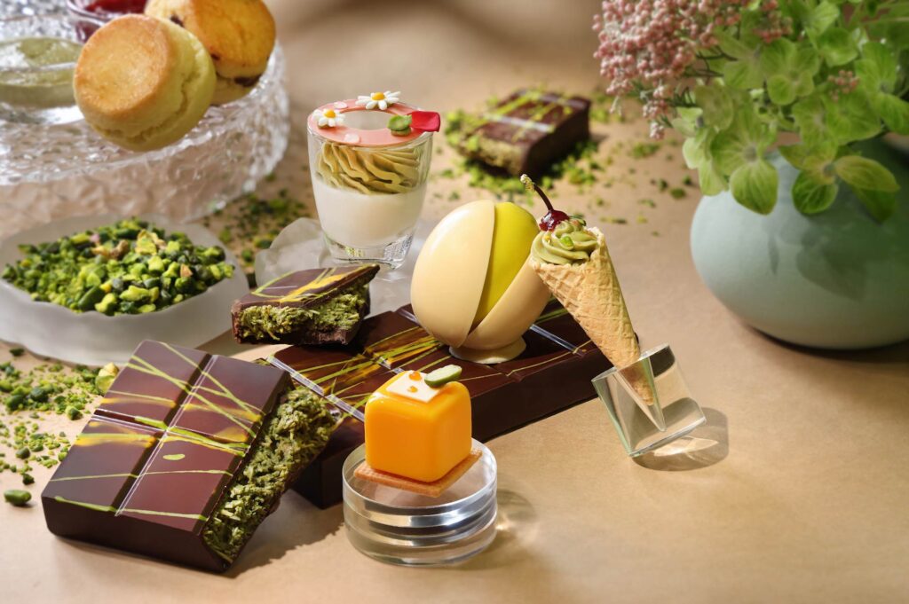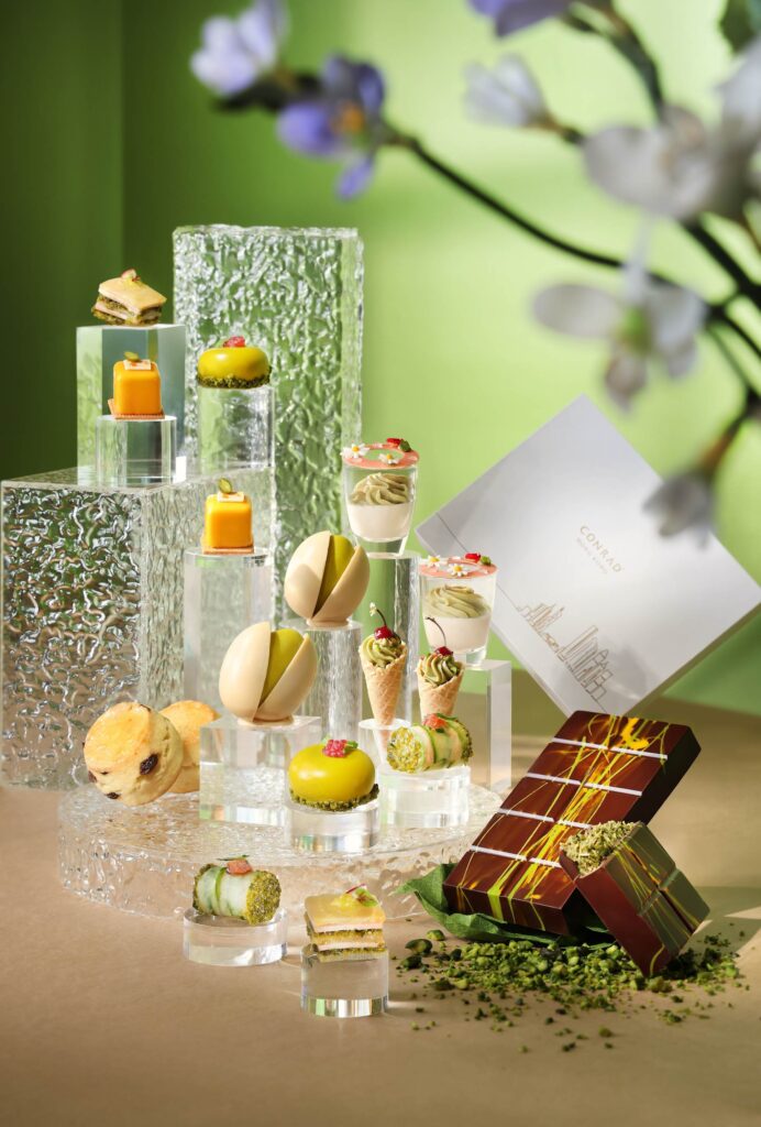 透明圓碟盛載著一系列賞心悅目、帶有清新綠意的鹹甜美點。率先映入眼簾的必是原粒開心果造型的開心果 100% 蛋糕,擬真度高又吸睛,白朱古力開心果外殼包裹著海綿蛋糕及開心果脆脆,散發果仁幽香;橘色外層的開心果杏 桃骰仔小巧別致,內層以開心果脆脆、杏桃慕絲及海綿蛋糕相間而成,酸甜清爽的杏桃增加整體風味和層次,堅果 香與果香交織的絕妙配搭,帶來新鮮的味覺體驗;鬆脆的開心果櫻桃脆筒中間注入開心果忌廉及車厘子醬,綴以車 厘子啫喱,層層細膩,帶出獨特的馥郁滋味;開心果士多啤梨意式奶凍香甜味美,開心果忌廉與士多啤梨奶凍相得 益彰,濕潤帶奶香,令人一試難忘。