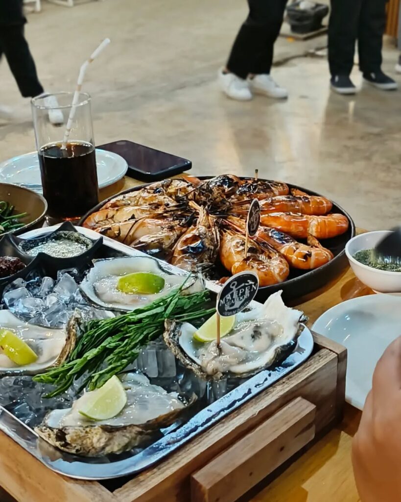 這裡提供現撈秤重的海鮮、各種泰式料理以及酒品。大家可以品嚐到烤大頭蝦、炸魚、炒青菜等美味佳餚。