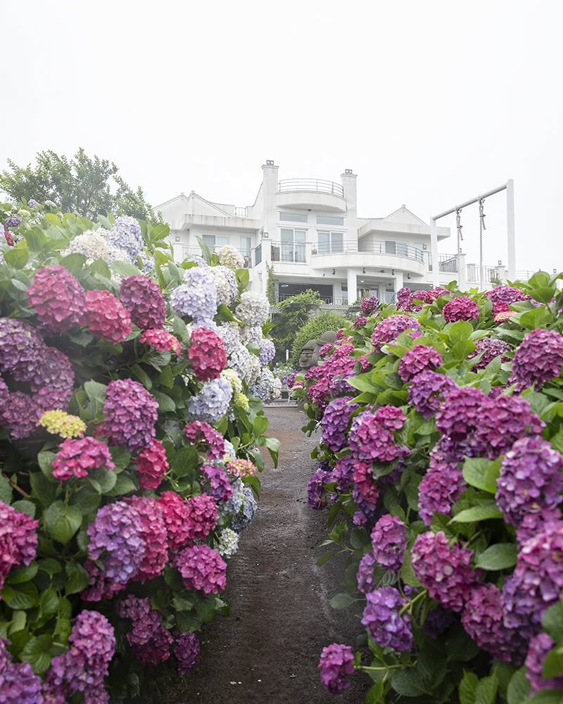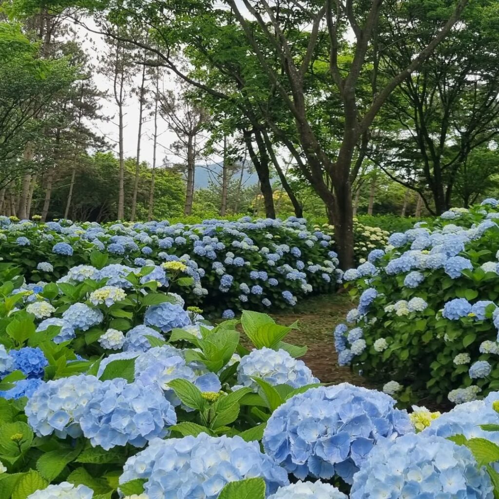 位於濟州島西歸浦市的「山茶花之丘」,是亞洲最大的山茶花植物園,除了山茶花外,園區內也種植了大量繡球花,每年夏季都會盛放,通往大溫室的繡球花小徑與溫室外的夢幻粉藍色繡球花牆都是絕美的打卡位!