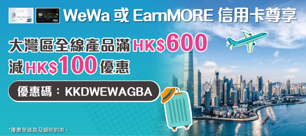 預訂大灣區產品消費滿HK$600,輸入優惠碼「KKDWEWAGBA」,即享HK$100折扣優惠。