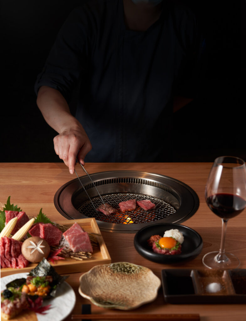 燒肉 – 厚切和牛舌芯、和牛三種類、野菜三種類 、蒜味醬油漬和牛草肚 或 阿波尾雞腿肉 (二選一)