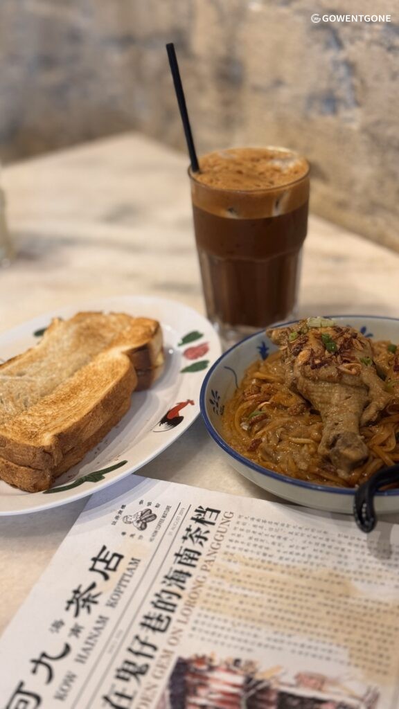 店内必點的海南早餐三件套,雪油加央烤麵包,外酥內軟的吐司夾入三條奶油與自製咖椰醬,濕潤清香,被評為「經典不敗組合」。半熟蛋搭配醬油與白胡椒,口感滑順,類似日式溫泉蛋。最後就是一杯傳統海南茶,混合茶、咖啡、煉乳與淡奶,苦香濃郁。