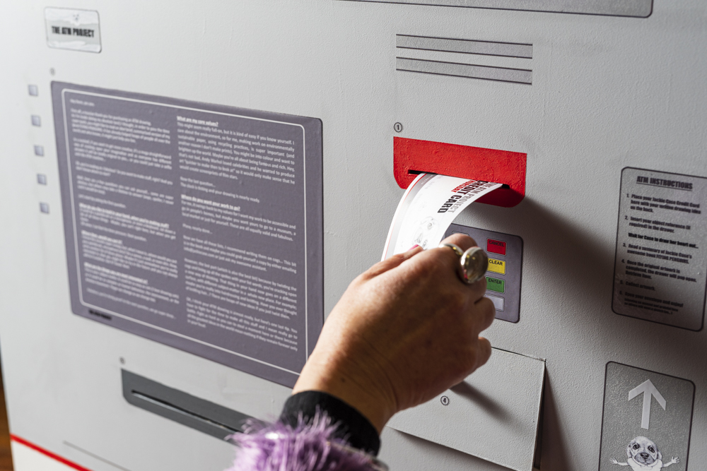 這件 裝置藝術 偽裝成一台功 能性的自 動提款機,並邀請藝術家現場即席速描,讓參觀者以港幣 300 元購入原創的藝術作品——或許是他們的第一件藝術收藏,同時引發關於藝術家在塑造意義中角色的討論。
