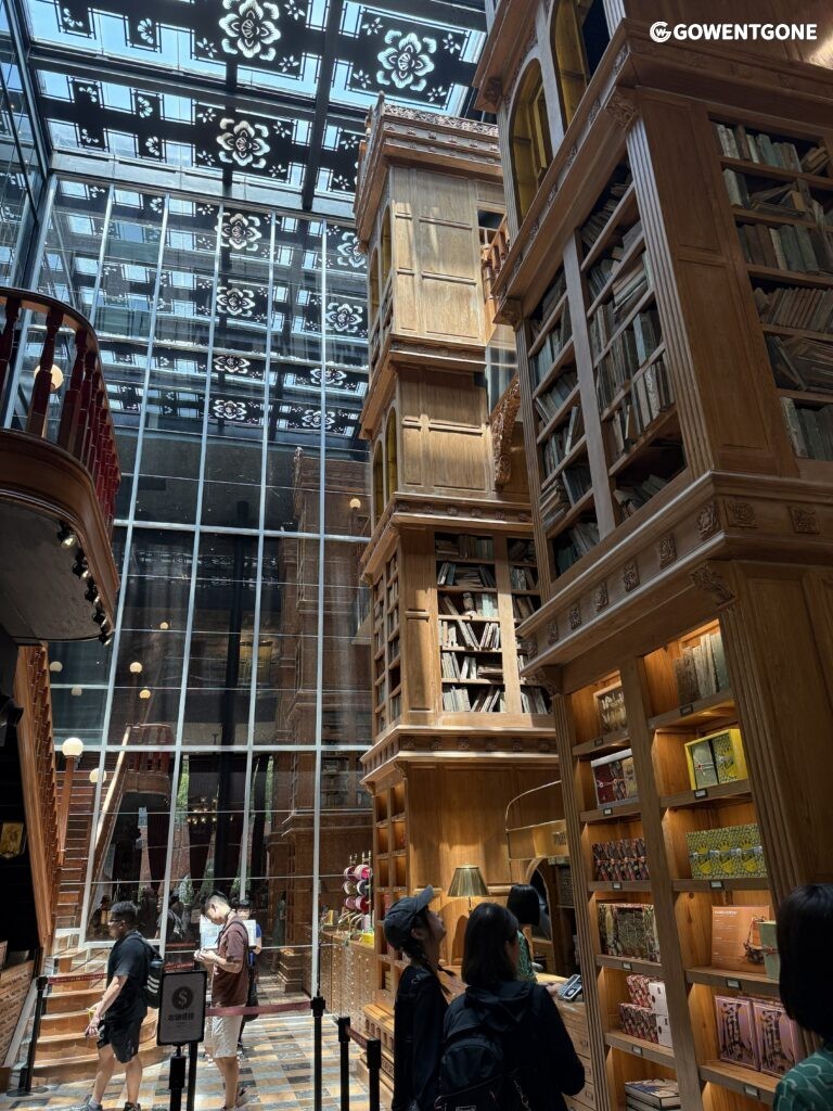 中央大廳有一個巨型書櫃,營造出圖書館的氛圍,書背上印著有趣的名稱如土鳳梨酥、18號巧克力,近看原來是包裝精美的伴手禮,創意十足!