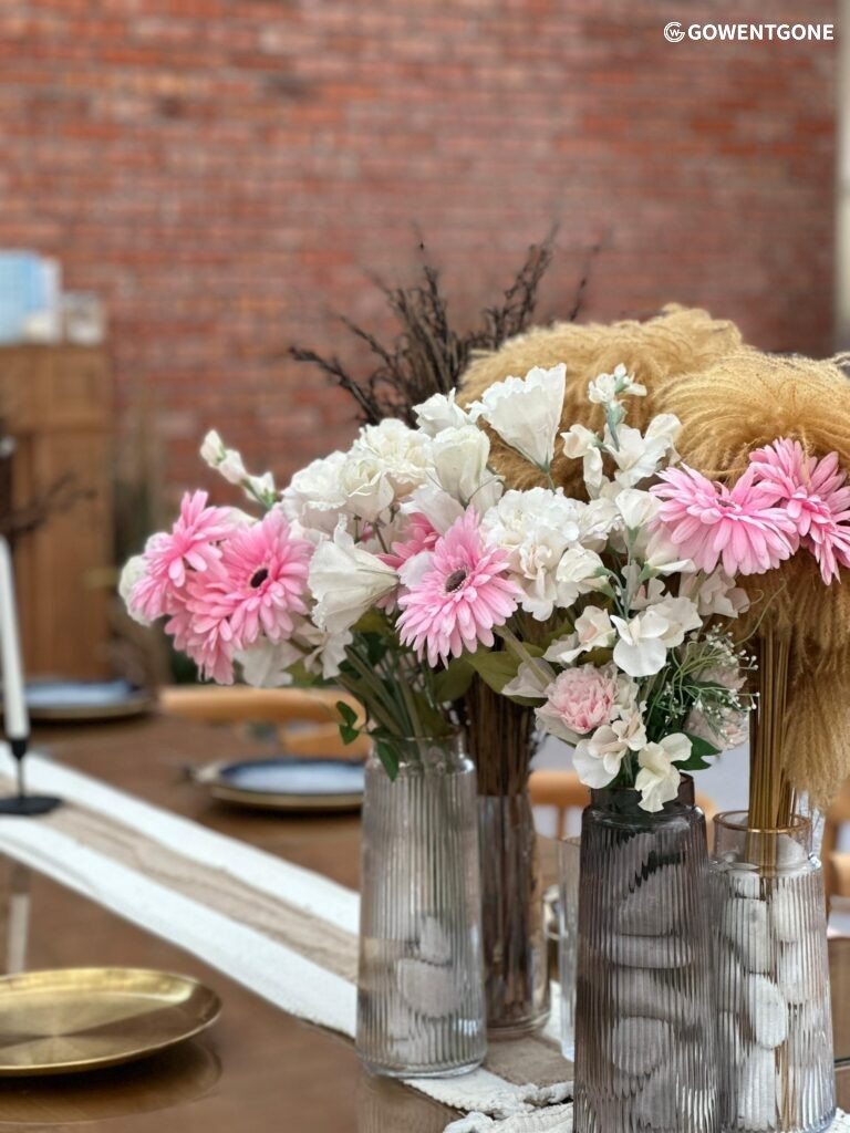 中間則是一系列的小矮桌和低椅子,十分休閑風;而餐廳的另一端、是低調奢華的長餐桌,正式的西餐餐具、粉色的花朵及蓬鬆的禾本科植物,頭頂是輕紗還有復古仿水晶吊燈,一切都超夢幻!