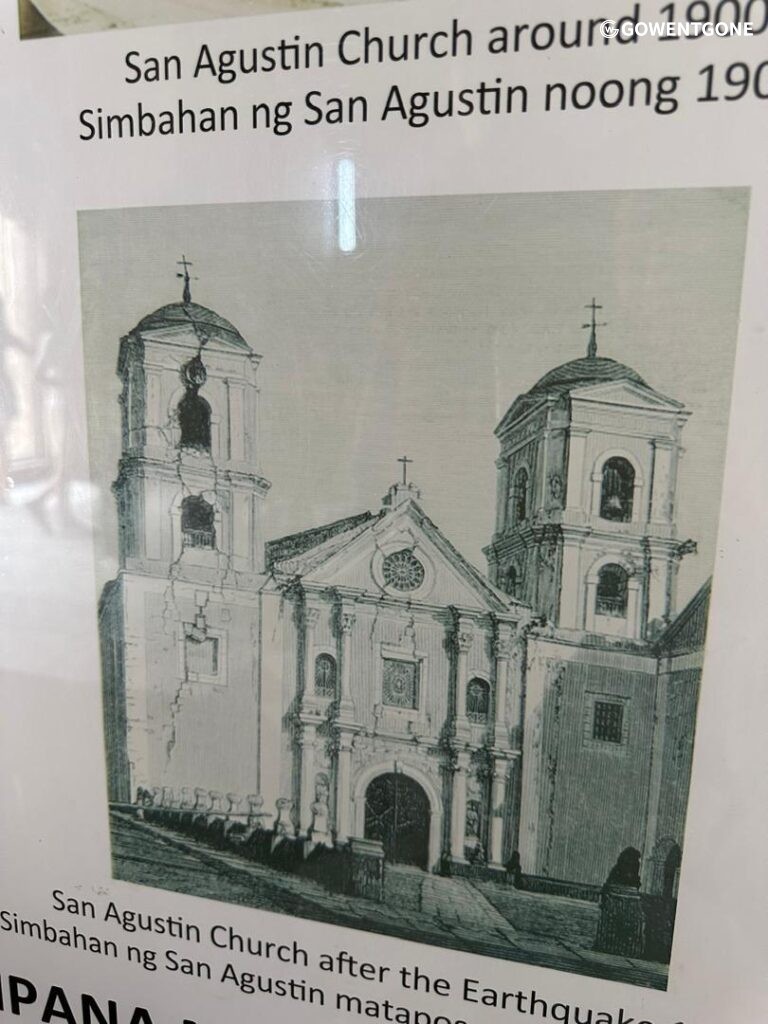 1863年6月3日,馬尼拉發生摧毀性的大地震,【聖奧古斯丁教堂】居然是唯一沒有倒塌的公共建築物;往後的17年間,教堂經歷了6次的地震都屹立不倒,直至1880年馬尼拉連續2天的地震,【聖奧古斯丁教堂】再一次挺住了,只是鐘樓出現裂紋,於是將鐘樓上重達 7,500磅 的大鐵鐘移到教堂的地面。