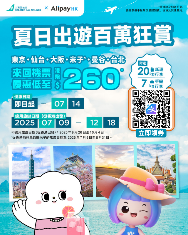 暑假想盡情玩樂,又想慳到盡?AlipayHK為你送上多重外遊驚喜!由即日起,AlipayHK推出「夏日出遊百萬狂賞」,用戶透過旅遊相關消費最高可賺$1,000(港元,下同)回贈,同時聯乘大灣區航空推出限時機票優惠,日本、台灣、泰國航線票價低至$260,讓你從旅程預訂到旅途消費處處慳更多!立即掌握以下優惠攻略 。