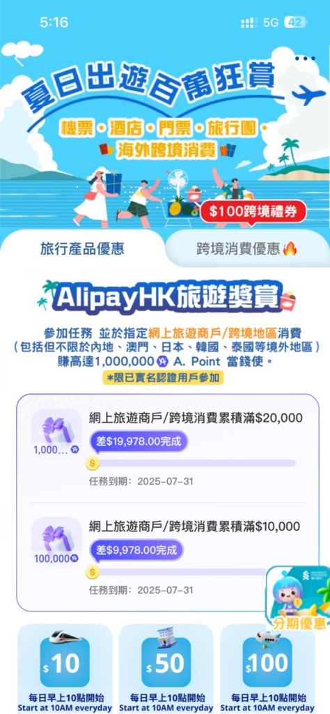 AlipayHK將不定期更新各項精選旅遊優惠,立即開啟AlipayHK手機應用程式,瀏覽「2025夏日旅遊優惠攻略」並領取更多旅遊商戶如AlipayHK旅行+、KKday 、Klook、HopeGoo、永安旅遊、Trip.com等的旅遊優惠,享受最超值的夏日之旅!