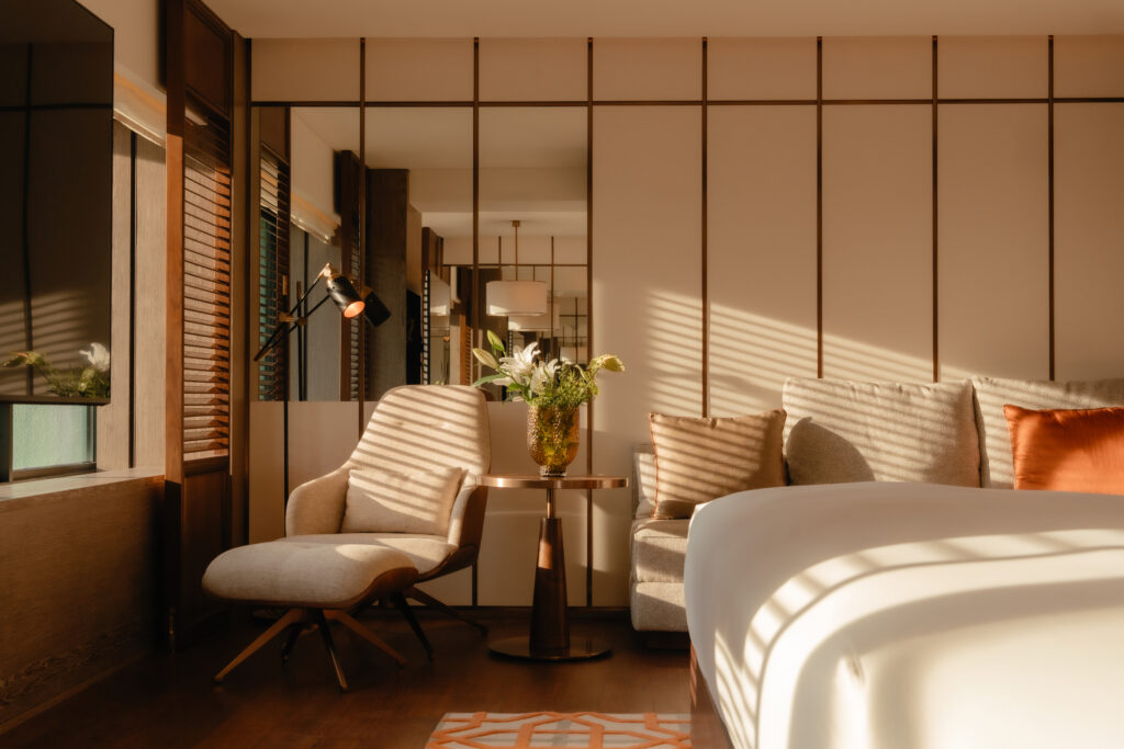 豪華翼樓由東京設計師事務所 Strickland 設計,巧妙融合新加坡的都市活力與精緻風格,為賓客帶來全新體驗。包括升級改造後的豪華客房在內,豪華翼樓共設 407 間客房,均採用開放式空間設計,配以溫馨的胡桃木地板,娘惹風格點綴以及浴室內的巴塔哥尼亞石材。赤陶橙色調與現代幾何圖案互相輝映,既彰顯這座城市的蓬勃活力,亦完美營造出奢華住宿的寧靜氛圍。