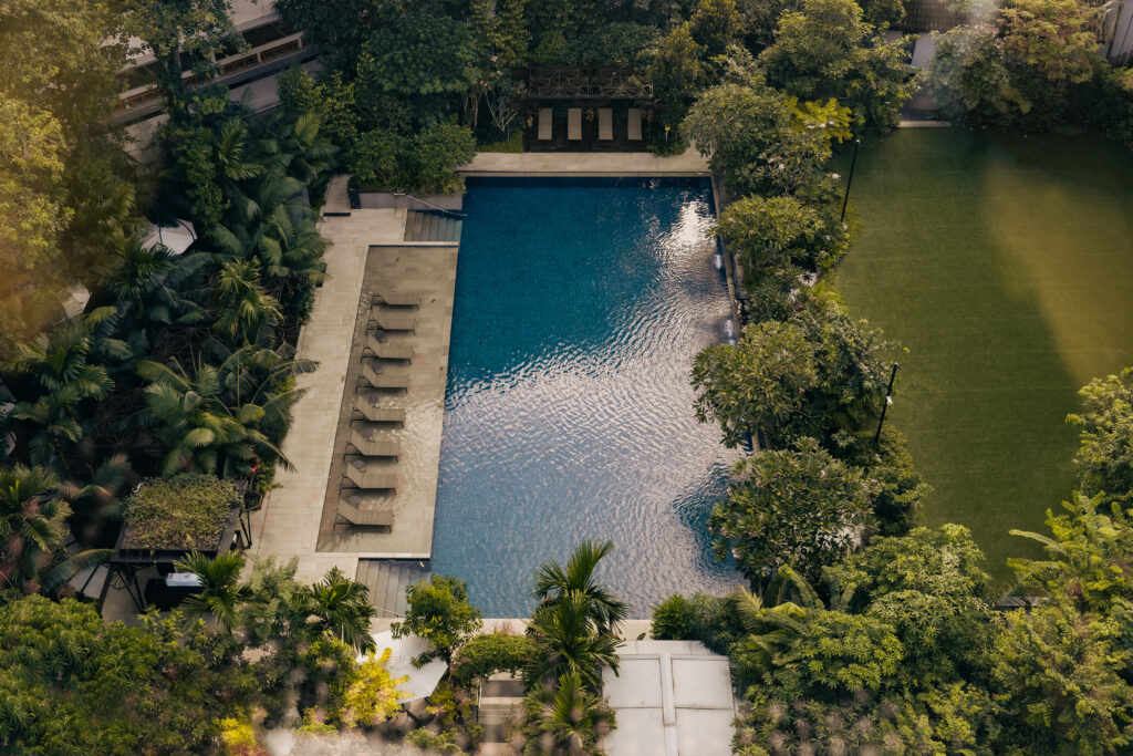 在這段路徑的中心地帶,一座以酒店改造時回收的花崗岩所打造的疊層瀑布成為點睛之筆。鄰近更設有經精心規劃的雕塑探索徑與趣味互動設施吸引家庭遊客前來探索,而草坪則成為瑜珈課程、健身訓練及養生活動的理想場地。全景式生態設計不僅提升了賓客體驗,更透過擴大授粉昆蟲棲息地和雨水滋養的生態系統,為新加坡的生物多樣性保育作出貢獻。