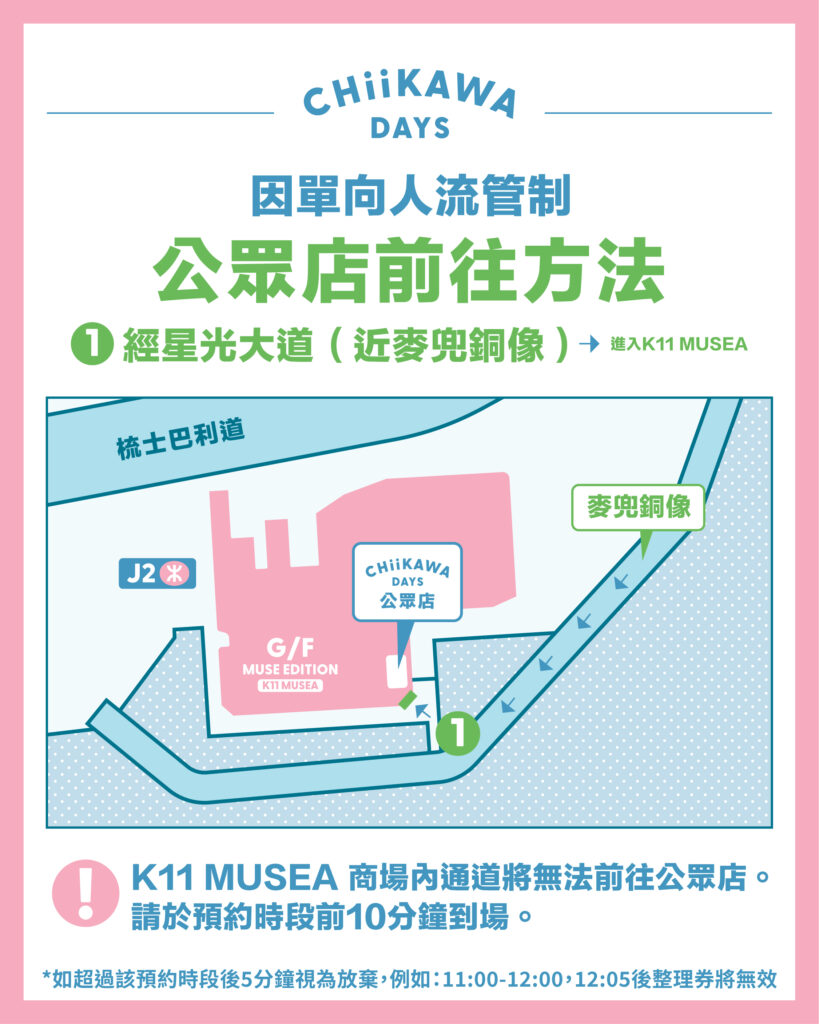 即日至 8 月 31 日期間,星光大道將將實施單向人流管制措施。持「CHIIKAWA DAYS」特展門票的訪客,請先前往室內展廳兌換手帶後入場參觀。前往室內展廳,請經港鐵尖東站 J2 出口或梳士巴利道出入口進入 K11 MUSEA。因應人流管制安排,請提前 15 分鐘到場辦理入場手續。請注意,單向管制期間,K11 MUSEA 商場內通道將無法通往公眾店;如需前往公眾店,請改由星光大道近麥兜銅像的入口進入。