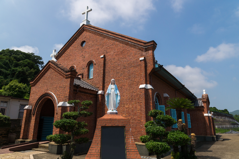 日本出津教會在日本禁教時期是教徒的救贖燈塔。法國神父多羅為避政府耳目,將教堂設計成日式土藏造倉庫外觀,內部卻是哥德式穹頂。祭壇使用江戶時代隱藏教徒傳承的聖器,木雕葡萄紋象徵「基督之血」,全球僅此一處。出津教會旁步行一分鐘就是多羅神父紀念館。據説,當年多羅神父發現許多貧民,於是他教導農民種葡萄釀酒,以「酒廠」來掩飾信徒的聚會。其次,多羅神父也為被迫賣身的女性簽發 「瑪利亞之女」證書,幫助她們逃離火坑。多羅神父的事跡都能在紀念館中找到。