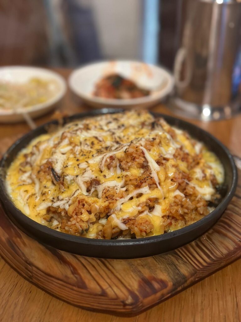 另一道必點的是芝士泡菜炒飯,視覺與味覺同樣爆棚。炒飯粒粒分明,拌入酸香開胃的泡菜與拉絲芝士,香濃之餘更添層次感。當芝士慢慢融化、與泡菜的酸辣融合時,整體味道變得滑順又帶點微微辣意,是令人欲罷不能的「罪惡」之選。