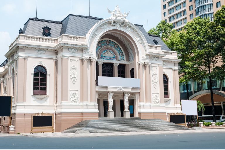 胡志明市市立歌劇院建於1898年,由法國建築師 Eugène Ferret 設計,是典型的第三共和國時期法式建築代表。外觀裝飾華麗,雕刻精緻,融合古典與浪漫主義風格。最初是為法國殖民官員與富商舉辦歌劇、舞會的場所,如今仍用於音樂會、芭蕾舞與文化活動。