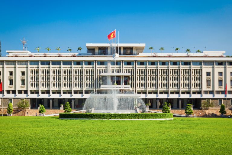 統一宮原名「獨立宮」,是南越總統的辦公與官邸所在地。1960年代由著名越南建築師吳越授設計,融合現代主義與越南傳統風格。至今仍保存1970年代原貌,包括總統辦公室、會議廳與戰時地下指揮中心。1975年4月30日,北越坦克衝破鐵門,象徵越南南北統一,因此改名為「統一宮」。