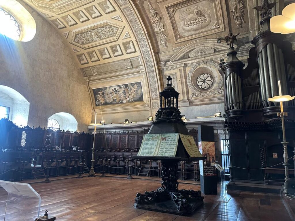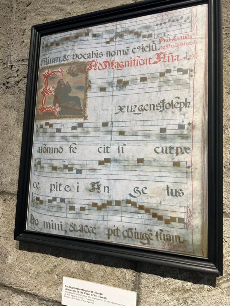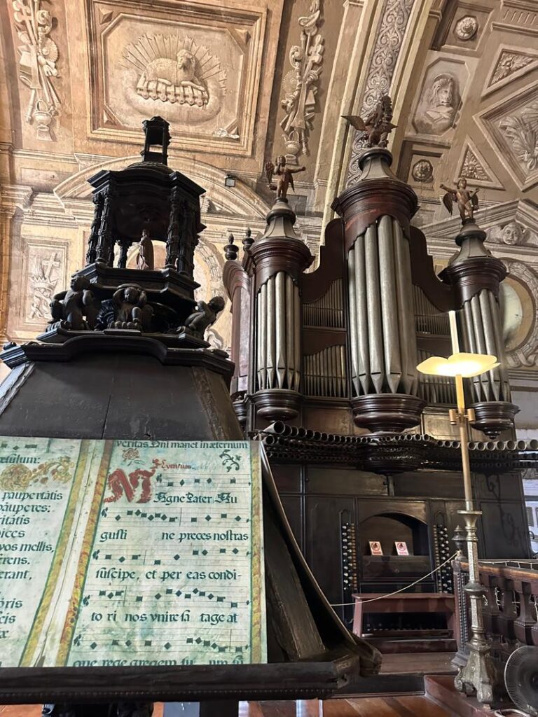 鐘樓與合唱席展區:博物院的2樓還有一個通道可以走到教堂講壇的二樓,擡頭便是精緻的手繪天花板,往下更能俯瞰聖奧古斯丁教堂整個大堂,左邊是18世紀保存至今的管風琴,還有百年前的手寫詩歌琴譜,非常珍貴!