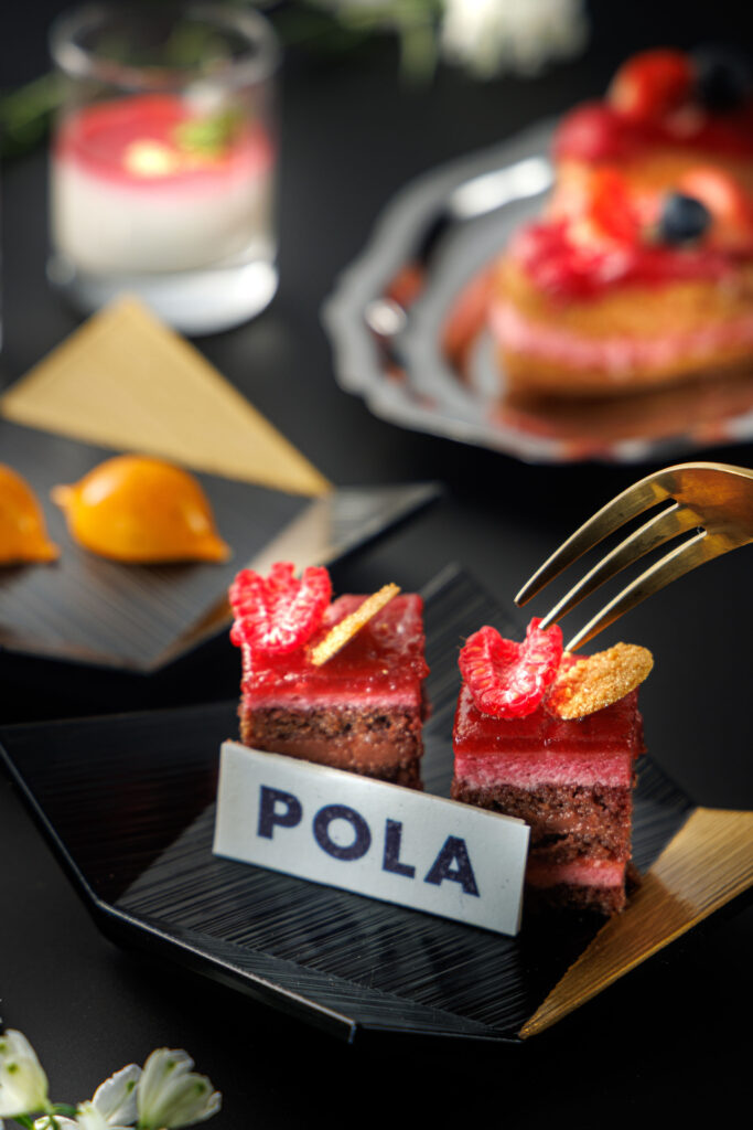 六款甜點同樣精緻誘人,完美呼應POLA的品牌美學。接骨木花奶凍配櫻桃醬 口感細膩絲滑,並加入薄荷點綴,增添清新氣息;士多啤梨泡芙則外酥內軟,輕盈泡芙裹滿豐盈的奶油內餡,口感綿密幼滑。其他精選甜點包括清新可口的檸檬夾心朱古力,以及綴以POLA標誌的紅桑子朱古力蛋糕,酸甜有致,回味無窮。