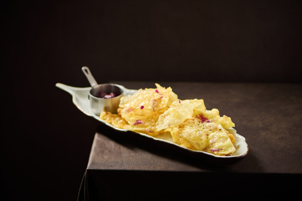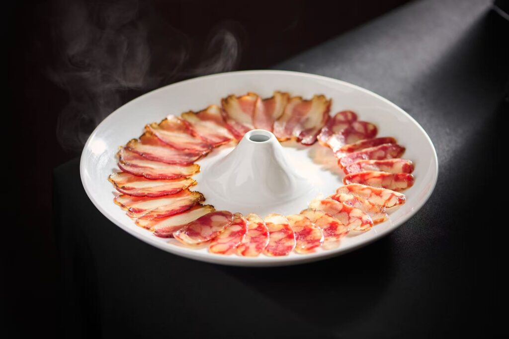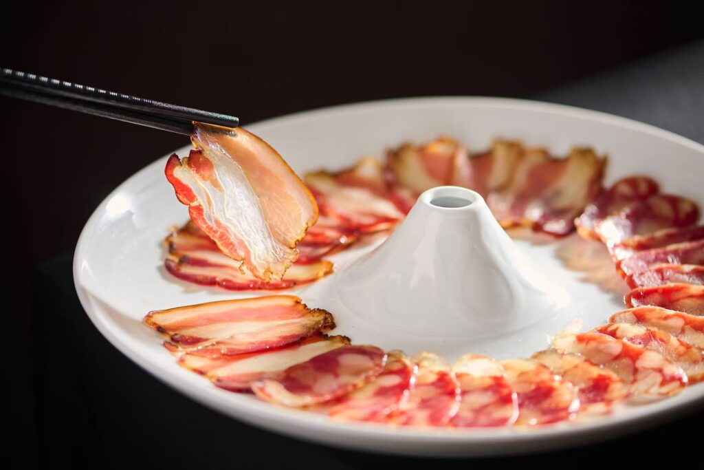 提及雲南,不能不提諾鄧火腿。它與金華、如皋火腿並稱「中國三大名腿」,產自大理諾鄧村的特殊地理環境,經傳統工藝發酵三年而成,風味絕佳。這道三年諾鄧火腿配手撕乳扇(港幣$328)將火腿切成薄片,搭配大理白族獨創的手撕乳扇。乳扇被譽為「雲南奶酪」,是以鮮牛奶混合酸漿加熱拉製,晾乾後形成薄片。火腿的鹹香醇厚與乳扇的濃郁奶香及柔韌嚼勁在口中交織,帶來獨特滋味。
