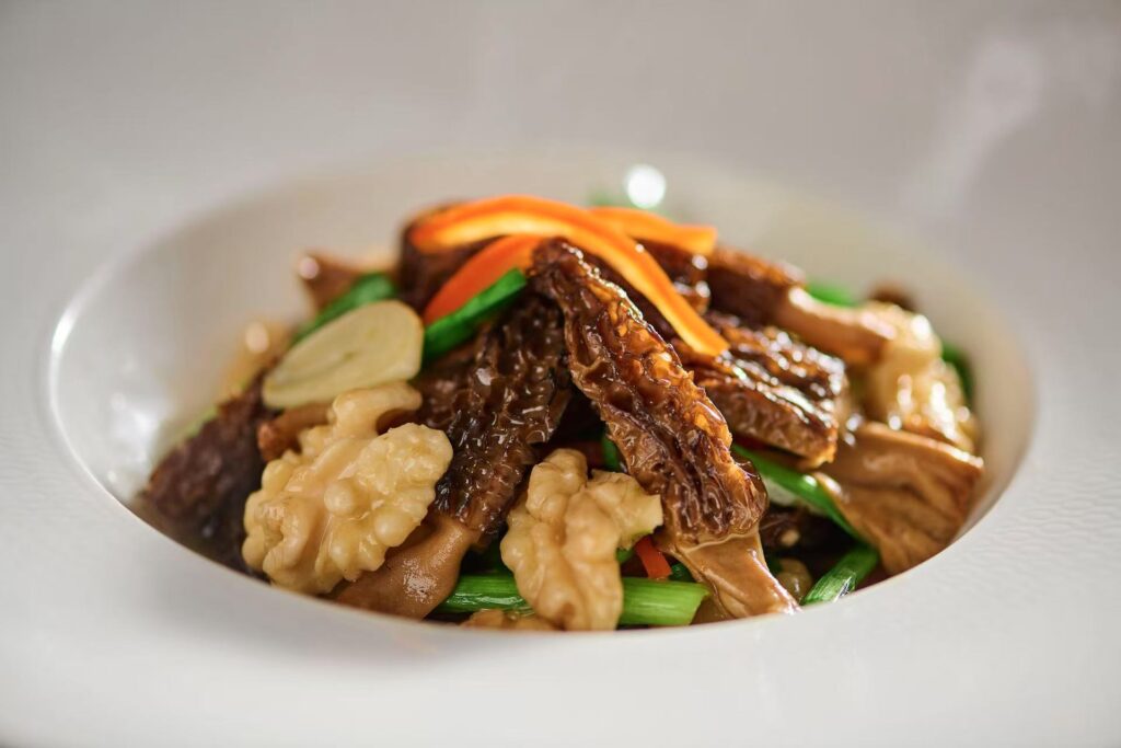 另一道推薦菇菌菜式有火絲銀芽虎掌菌(港幣$528),虎掌菌是雲南山林的珍稀饋贈,因其形似虎爪、香氣奇特而得名。它僅生長於高山懸崖之間,鮮菌清香,乾菌則香味加倍醇厚。大廚將其與宣威火腿絲和清爽的銀芽一同爆炒,火腿絲的鹹鮮油脂,引出了虎掌菌的濃郁野性,而銀芽的清脆則巧妙地平衡了整體口感,將山珍的奇香、火腿的醇厚與蔬菜的清爽融為一體。版納包燒雜菌(港幣$128),「包燒」是雲南傣族極具代表性的烹飪手法。精選黑皮雞樅、舞茸菌、黑皮牛肝菌等多種時令野菌,以香茅草、小米辣等當地香料調味後,用新鮮的芭蕉葉包裹,置於炭火上慢慢烤熟。芭蕉葉的清香滲入菌菇之中,保留了食材的本真原味,完美詮釋了「取之自然,食之本味」的雲南飲食哲學。