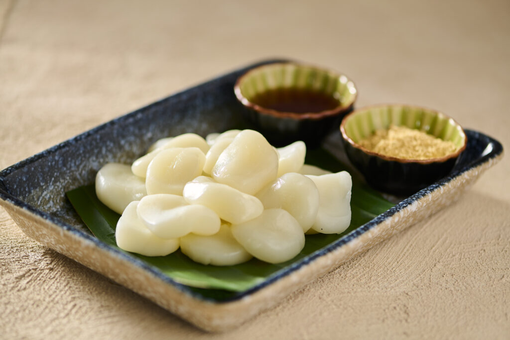 玫瑰醬豆面冷吃餌塊(港幣$68),餌塊是雲南最具代表性的小吃之一,由大米製成,口感與年糕相似但更具米香。大廚將其切片後,淋上香甜的玫瑰紅糖醬,再撒上炒香的黃豆粉。入口軟糯,玫瑰的芬芳、紅糖的甜蜜與豆粉的醇香交織,是一道清涼爽口、風味獨特的開胃小點。堅果米布(港幣$18),是將大米磨成漿,與鮮牛奶一同慢火熬煮而成。口感綿密軟糯,質地介於濃湯與奶酪之間,濃郁的奶香與純粹的米香溫柔交融,甜而不膩。綴以香脆的堅果,為這份樸實的甜蜜增添了更豐富的層次。