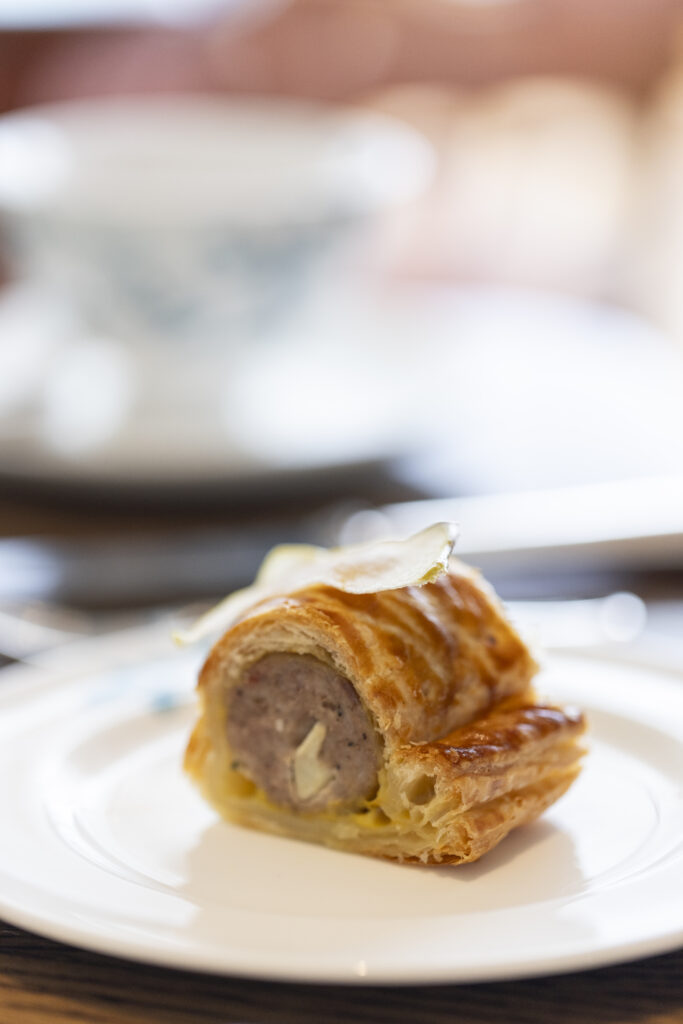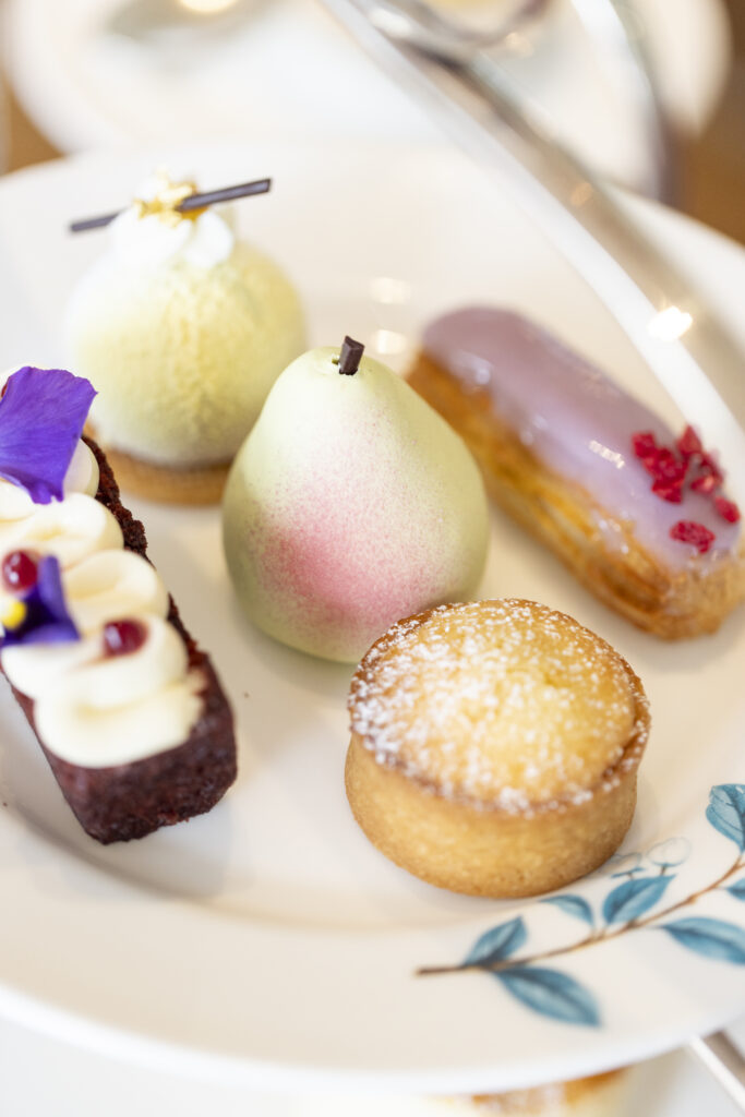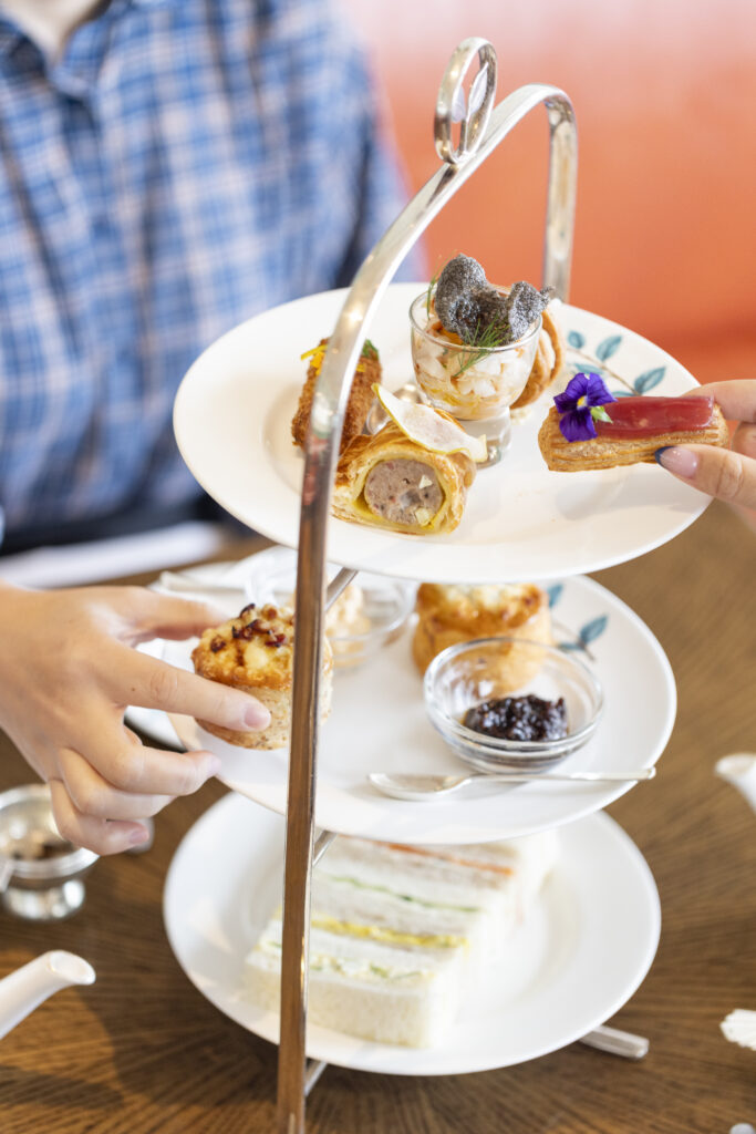 而經典下午茶的頂層則揉合中秋節日元素,主打鹹蛋黃配蜂蜜柚子撻——將傳統鹹蛋黃與蜂蜜柚子茶釀入餡餅,展現中西合璧的玩味元素;另更有紅絲絨蛋糕、芋頭芒果慕斯、紅莓茉莉泡芙,以及造型十分吸睛的洋梨慕斯佐焦糖合桃等精緻茶點。