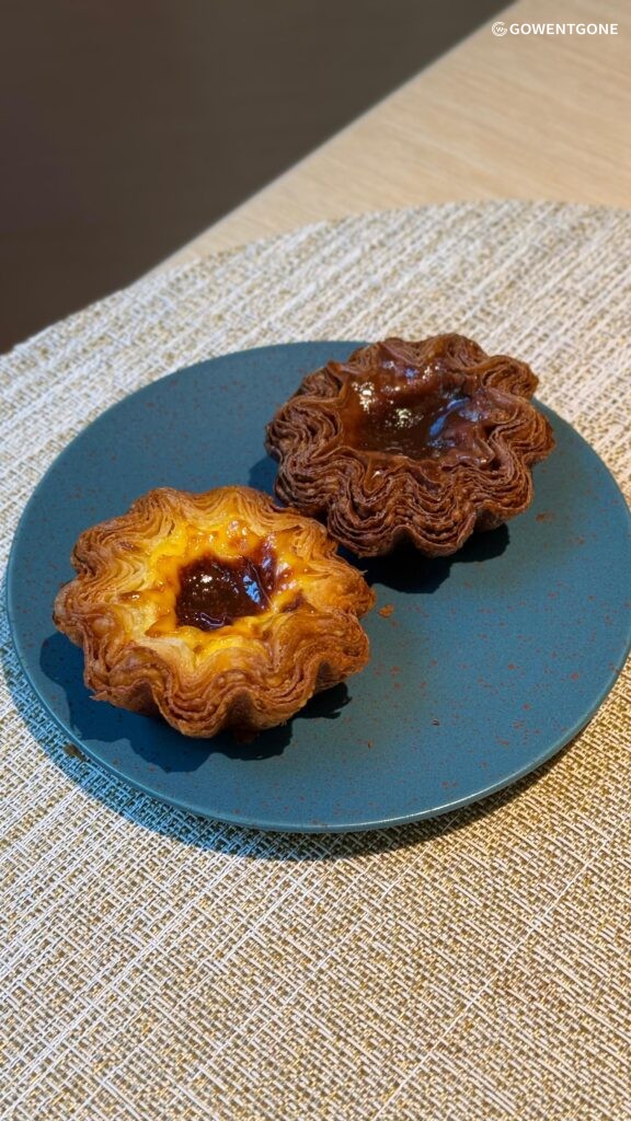 店內最矚目的招牌就是酥皮蛋撻。蛋撻每日分六輪出爐,為了讓更多人能夠品嚐,店家規定每人限購四件,因此幾乎每次出爐都會瞬間售罄。原味蛋撻以葡式蛋撻為靈感,餅皮層層分明,口感酥脆卻不油膩。蛋漿綿密幼滑,蛋香濃郁並帶有淡淡奶香,甜度恰到好處。朱古力蛋撻則在原味基礎上加入法國Valrhona黑朱古力醬,味道濃厚而苦甜平衡,口感層次更加豐富,讓朱古力愛好者欲罷不能。