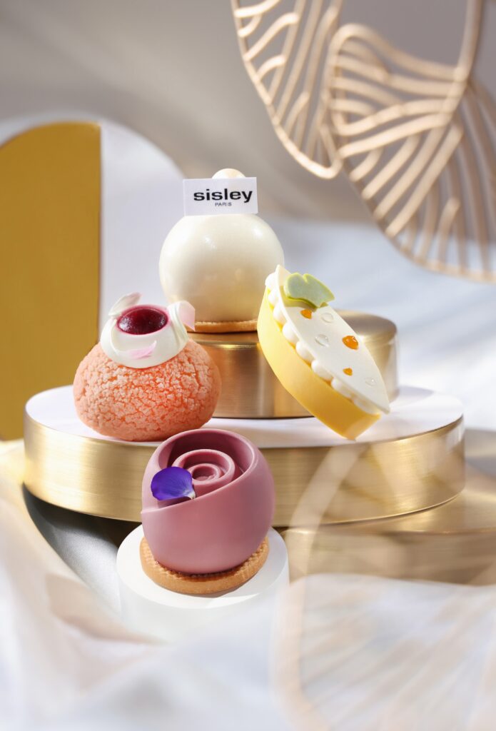 甜點同樣挑動味蕾,透著珍珠般盈亮光澤的豆乳銀杏慕絲豆香滿溢,以豆奶及銀杏巧製而成,口感滑順、輕盈綿密,與品牌的關鍵活性成分大豆相呼應;呈圓弧形的蜂蜜乳酪慕絲小巧別緻,黃色的朱古力脆皮外層包裹著蜂蜜乳酪慕絲,中間擠上雲呢嗱忌廉,表層綴以Sisley靈魂成分之一的銀杏葉及芒果啫喱,一口咬下輕盈柔滑,味道清甜細緻;淡粉紅色的馬鞭草蘋果泡芙酥脆內軟,注入香甜的蘋果醬,頂層添上紅桑子啫喱,甜蜜誘人;夢幻紫色調的玫瑰薰衣草朱古力慕絲賞心悅目,吃進嘴裡香滑綿密,漫著淡淡花香,散發清新法式風情。