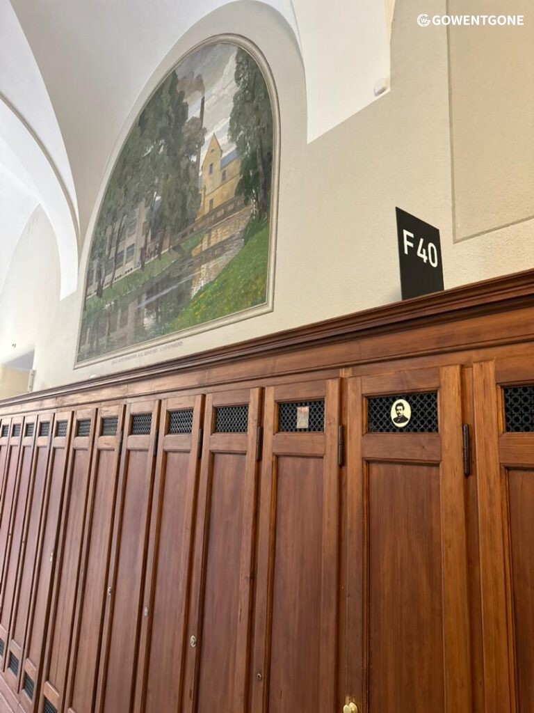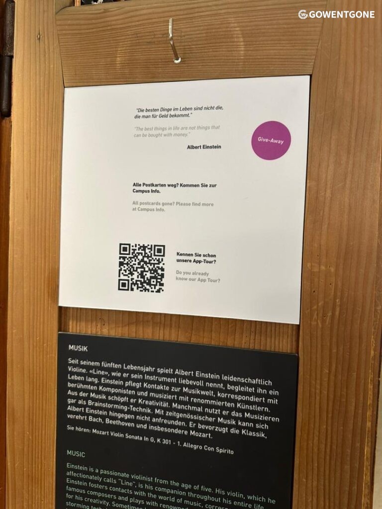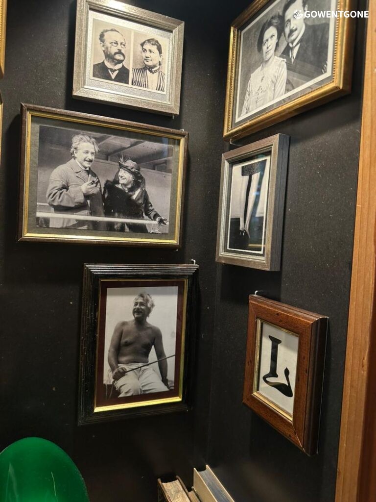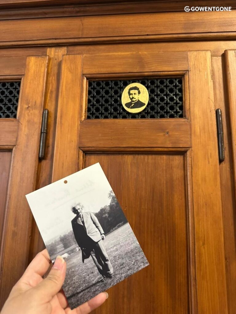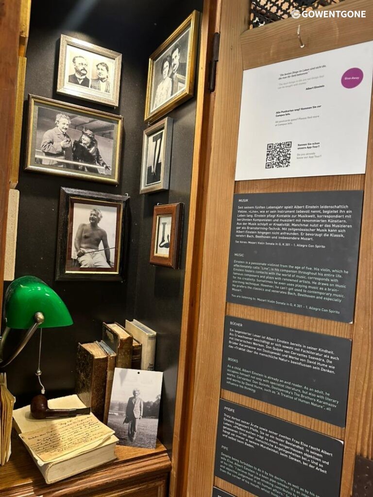 依著地圖來到2樓,左側便是一整排原木製的儲物櫃,遠遠的瞧見一個寫著‘40’的牌子放在其中一個儲物櫃上;就是這裏了!上方還有一張愛因斯坦的照片!櫃門並沒有上鎖,輕輕拉開,電燈亮起,愛因斯坦喜歡的小提琴音樂響起,見到挂滿了愛因斯坦的家人、包括和兩任妻子的照片。最下方的是他光著上身,非常輕鬆垂釣的生活照,親切又接地氣!櫃子裏當然還有他讀過的書籍、一些信箋、最珍貴的手稿,還有他最愛的烟斗。有一個説法:在校園裏,愛因斯坦被烟霧繚繞的形象幾乎與他的理論齊名。儘管抽烟對健康不好,他卻有另一番説辭:【抽烟對人來對事情做出冷靜和客觀的判斷有幫助。】