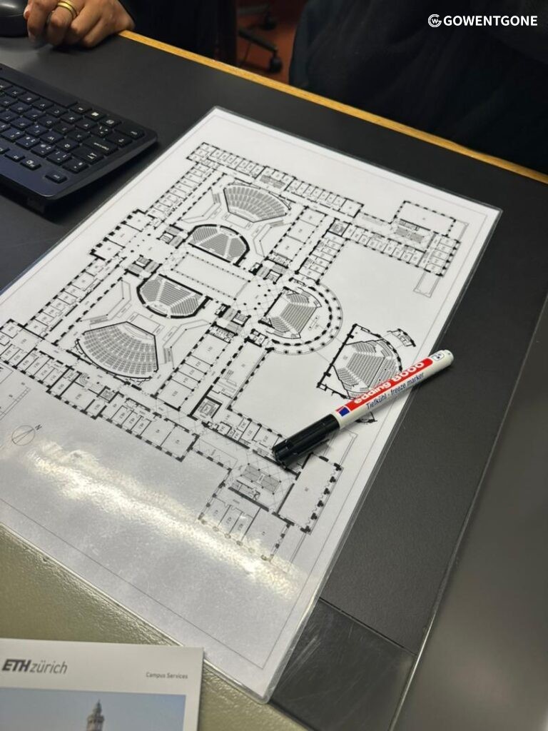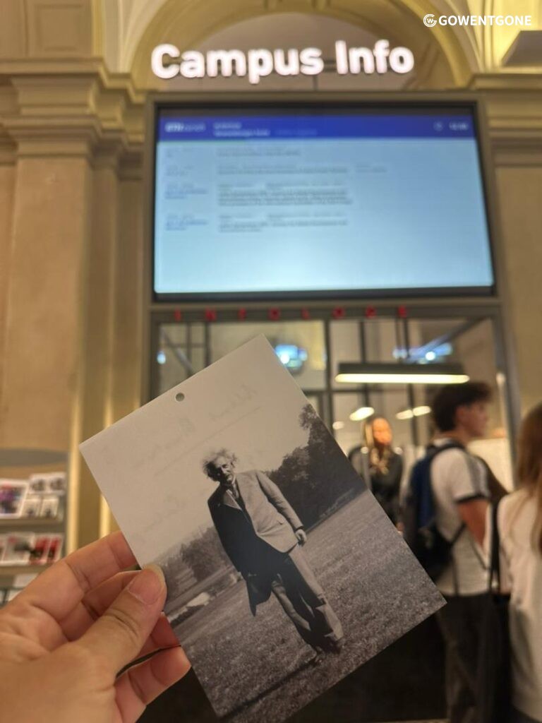 從市中心搭電車到校園門口(後來才知道正門在另一處),一進門就被大廳的氣勢震懾了,只知道要參觀愛因斯坦的儲物櫃,卻不知在這座大型建築物的哪一方!以爲隨便問一位同學就可指路,誰料她説是新生來報道,也不清楚,只好硬著頭皮排隊問詢問処。職員非常熱心的拿出地圖指引,后更熱情的問我們要不要愛因斯坦的明信片!太感動了!