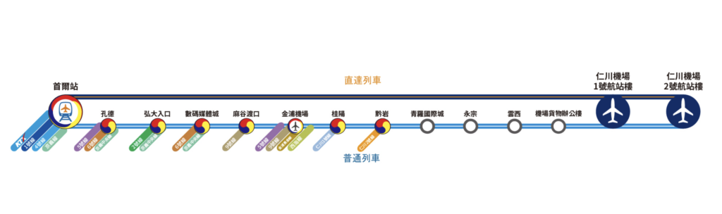 - 直達列車(Express Train):仁川機場 → 首爾站,全程 約 43-45 分鐘,不停靠其他站。