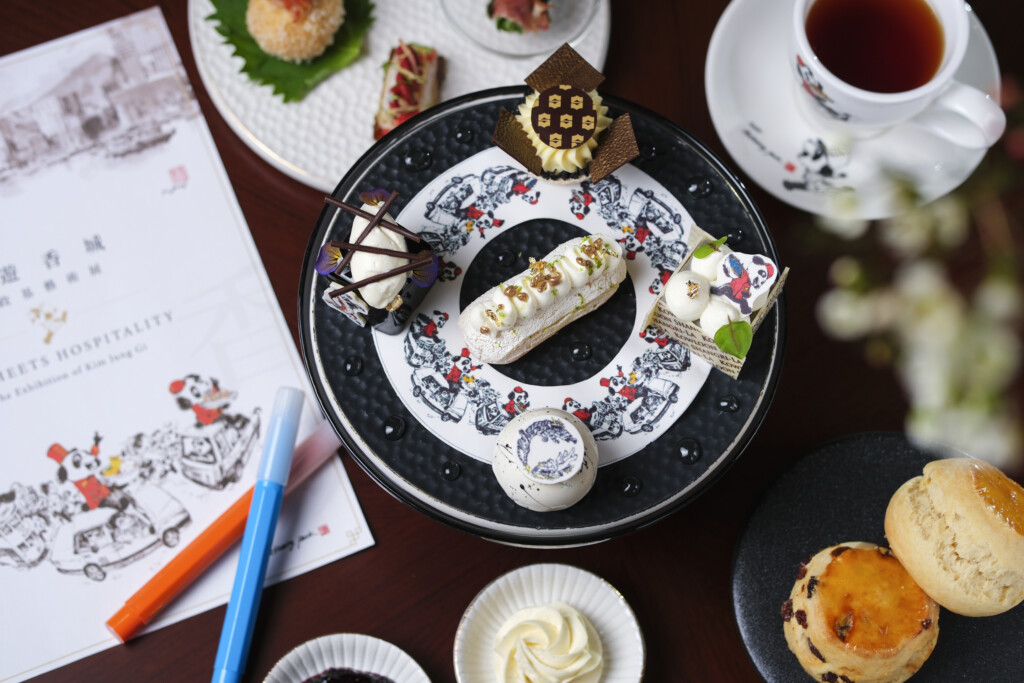 甜點同樣驚艷,精選黑松露朱古力、四季橘閃電泡芙及白朱古力芝麻馬卡龍,精緻細膩,讓人回味無窮。金政基先生及其高徒朴在光先生筆下生動的漫畫角色更為下午茶注入藝術氣息及故事色彩,讓這趟美食之旅充滿趣味。由朴氏悉心繪製酒店吉祥物 Edward 熊貓,點綴於黑芝麻芝士蛋糕之上,份外吸睛。白咖啡泥蛋糕則仿如白瓷藝術品,細緻黑白圖案與噴濺紋理,為甜品添上藝術氣息。下午配搭超過十款精選茗茶,讓你於悠閒午後,細味藝術饗宴。