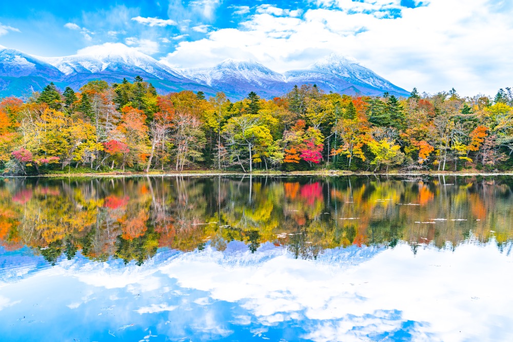 秋日中的青池被紅葉、白樺樹佐景,湖水倒影出夢幻畫面,是攝影熱門景點。