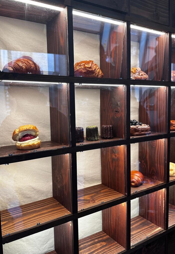 Bakemono 的招牌是各式精緻酥皮甜點與鹹點。每日限量的 Almond Yuzu Croissant 外層酥脆、層次分明,內餡柚子酸香清爽,搭配杏仁香氣,甜而不膩,讓人一試難忘。喜歡鹹點的話,Ham & Cheese Croissant 以高品質火腿和濃郁起司填滿黃金色可頌,是早午餐的極品選擇。此外,店內的 季節性丹麥酥(Danish) 如藍莓卡士達或草莓榛果醬版本,每一款都是視覺與味覺雙重驚喜。別忘了嚐一顆焦糖外殼、內裡柔軟的 法式 Canelé,或帶回家一條柔軟香甜的 日式奶油吐司(Shokupan)。
