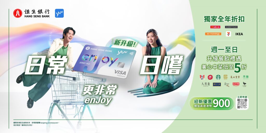 為吸引更多港人加入恒生enJoy卡的大家庭,恒生enJoy卡誠意推出升級迎新優惠,由即日起至2025年12月31日,凡成功申請恒生enJoy卡將可獲迎新優惠價值高達港幣900(包括高達120,000 yuu積分(相等於價值港幣600)及價值港幣300的美心中菜電子現金券)及永久免年費。每日以恒生enJoy卡消費,令「日常.日嚐」變得「更非常」,enJoy!