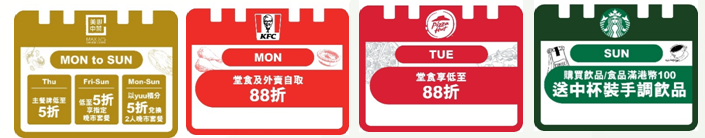 | Pizza Hut | 逢星期二堂食享低至88折(消費滿港幣250減港幣30) |