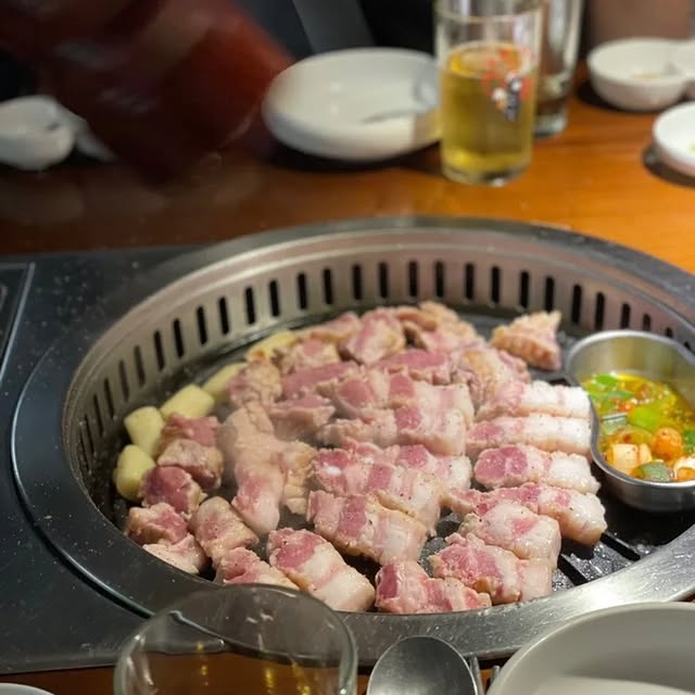 烤盤上滋滋作響的豬五花、牛肉香撲鼻,泡菜炒飯與海苔碎是靈魂搭配。人氣高但值得排!