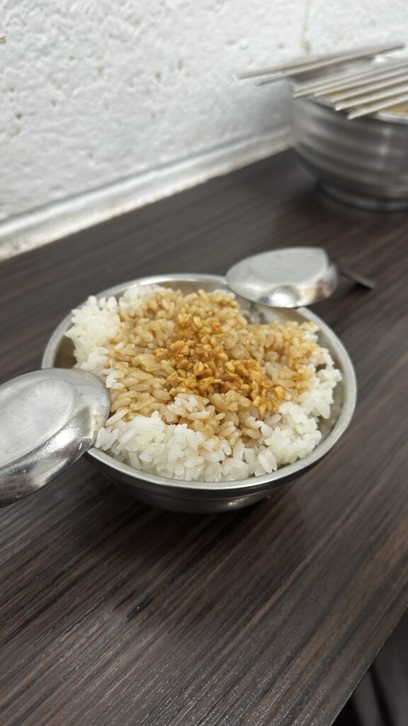 首先,麻油乾拌麵,麵條彈牙,包裹著濃郁的麻油香氣,每一口都能感受到香滑的口感再加入少許辣椒油,微微的辛辣,恰到好處地激發了食慾。接著是雞油拌飯,這道菜無疑是一個美味的驚喜。熱騰騰的白米飯淋上香氣四溢的雞油,輕輕拌勻後,米飯瞬間變得格外誘人。每一顆米粒都被雞油包裹,口感滑潤,還能感受到雞肉的鮮美,簡單卻又讓人回味無窮。