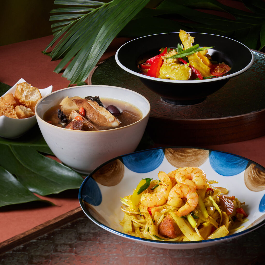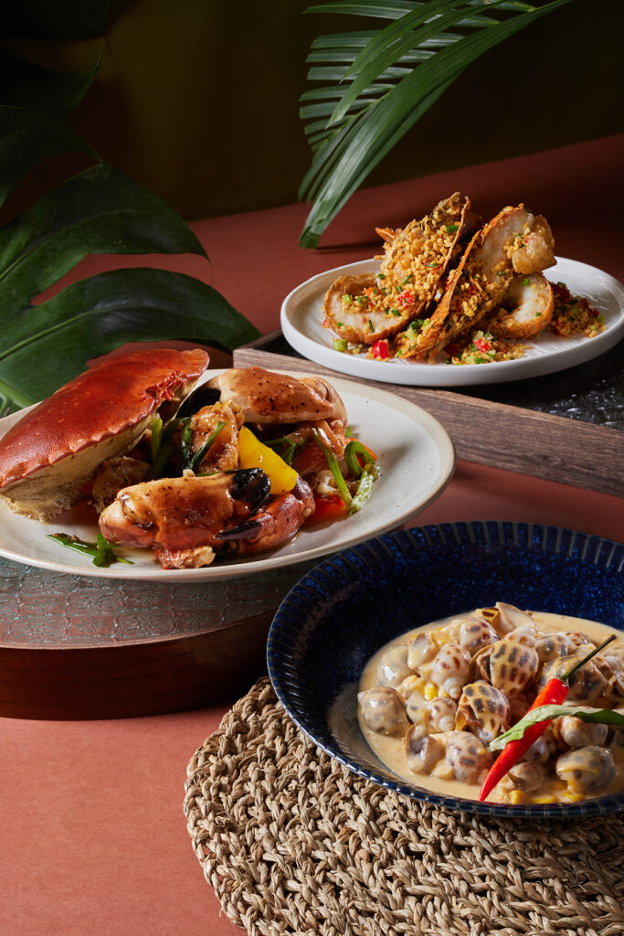 自助餐由多款開胃前菜打頭陣,包括鹹蛋黃脆魚皮香脆可口,鹹香濃郁;馬來椰子雞湯則以嫩滑雞肉、香料及椰漿熬製,暖胃又滋養,為整場盛宴揭開序幕。海鮮愛好者不容錯過主廚招牌星洲胡椒炒麵包蟹,蟹肉鮮甜,配上香辣黑胡椒醬,味道層次分明。假日自助晚餐限定的避風塘琵琶蝦,以濃郁的黑胡椒及蒜蓉炒製,香氣撲鼻,口感鮮嫩。另有創意十足的芝士鹹蛋煮花螺,將鹹蛋黃與芝士完美融合,包裹著鮮嫩花螺,帶來意想不到的驚喜滋味。