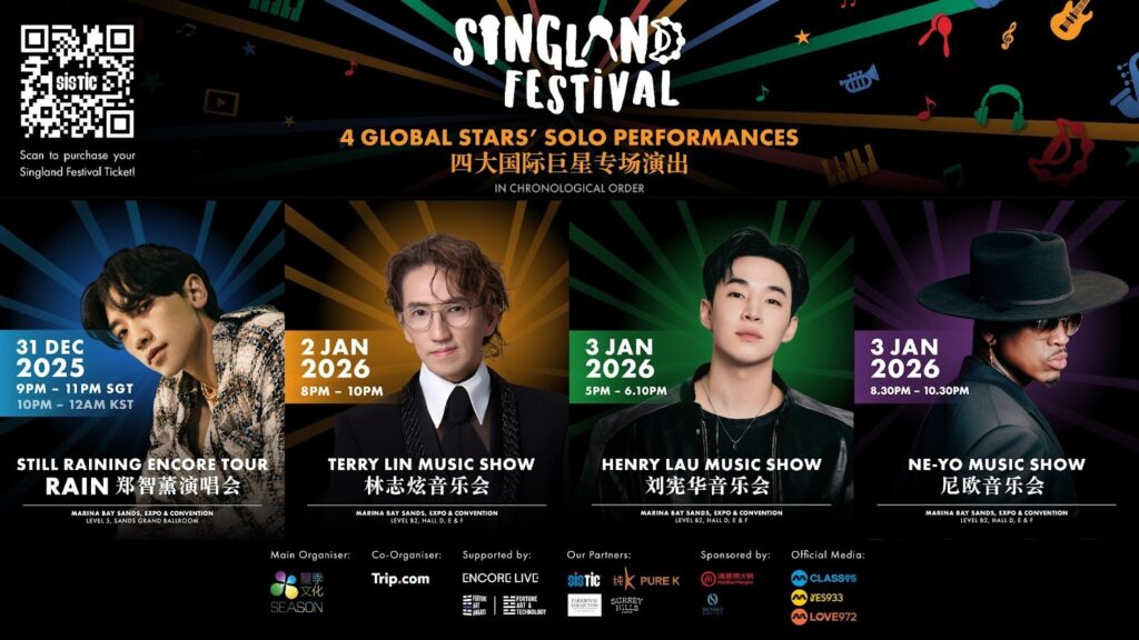 新加坡交響樂團將於濱海藝術中心音樂廳舉行音樂會,為觀眾帶來一場長達 1 小時 40 分鐘的精彩演出。節目涵蓋多首備受喜愛的聖誕經典曲目,包括《雪橇之旅》、《紅鼻馴鹿魯道夫》和《平安夜》,與大眾歡頌節日。新加坡首個大型室內跨年慶典即將登場!SINGLAND FESTIVAL 將於 2025 年 12 月 31 日及 2026 年 1 月 2 日至 3 日盛大登陸濱海灣金沙,匯聚四位國際頂尖藝人—— 劉憲華(Henry Lau)、Ne-Yo、Rain(鄭智薰)、林志炫 —— 呈現四場獨家演出,打造一場震撼難忘的節日盛宴。為慶祝新加坡建國 60 週年,SINGLAND FESTIVAL 融合震撼現場演出、尖端舞臺製作與沉浸式互動體驗。每場演出風格各異——流行、R&B、抒情、跨界,配合震撼視覺與音效,帶來全方位感官震撼!