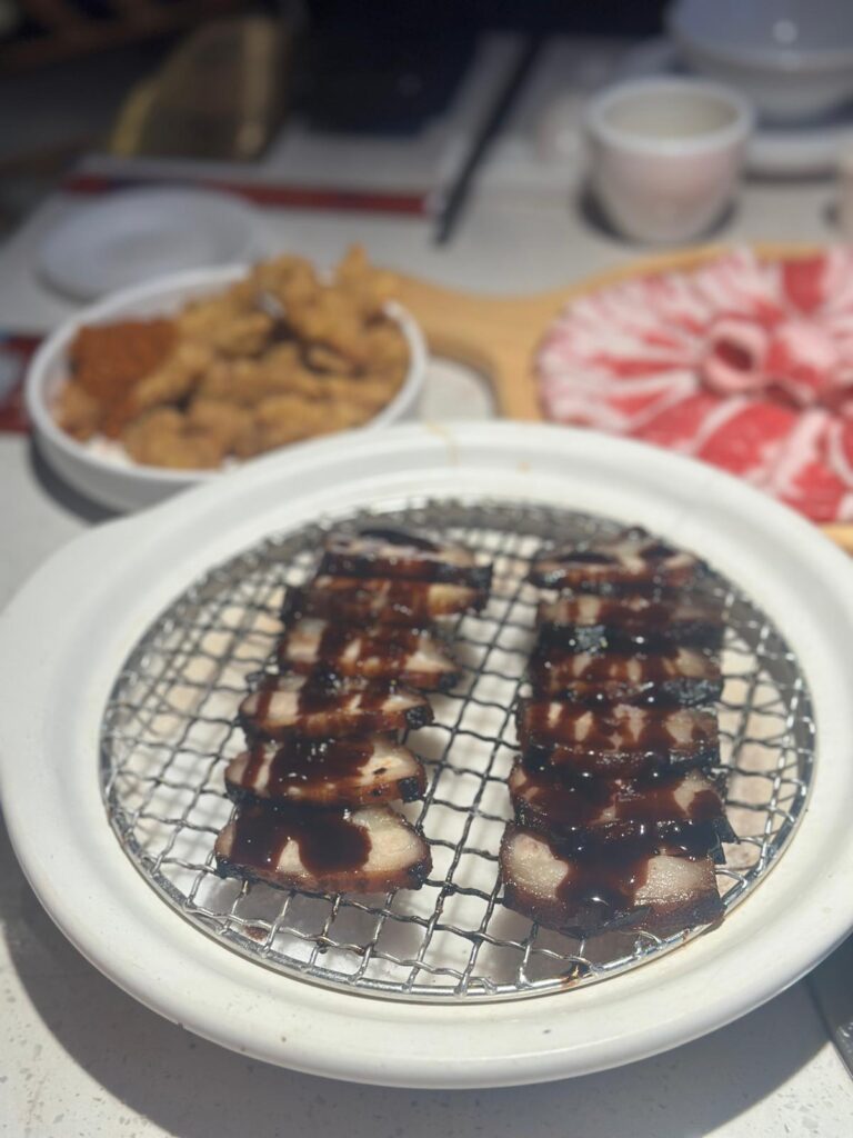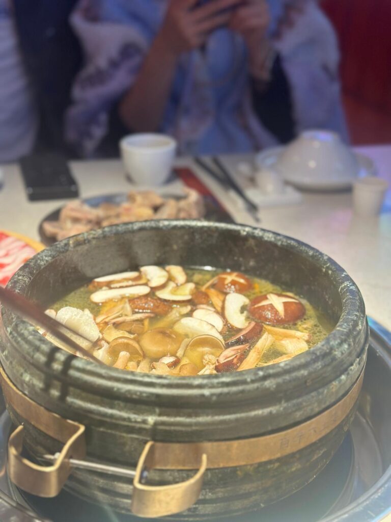 除了菌火鍋,店裡的叉燒更是意外驚喜。採用本地黑豬,先醃後烤,外層微焦帶甜,內裡柔軟多汁。不需要任何蘸料,單吃就很有靈魂,配上菌湯更是剛剛好。